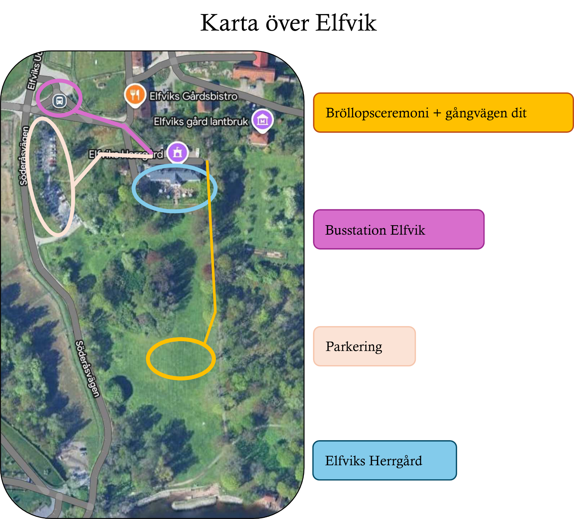 Buss 204 från Ropsten går direkt till Elfvik. Från stationen så kan du följa en kort grusväg (bakom bussbåset) upp mot Herrgården. Går du på sidan om herrgården finns det en väg som leder ner till platsen där ceremonin kommer att ske. Se bildkarta längst ner.